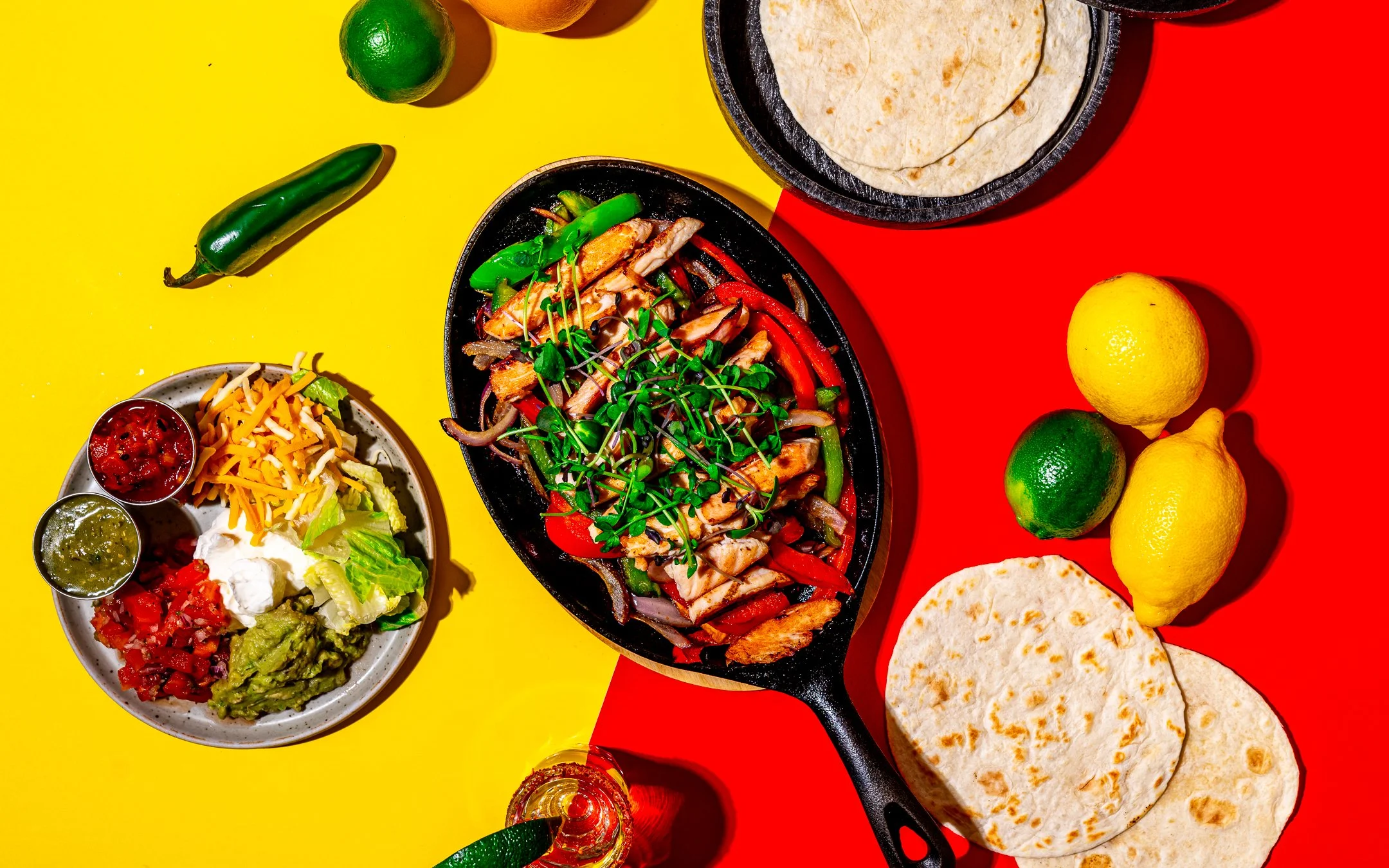 Poivrons rouges, poivrons verts et oignons rouges. Servi avec un mélange de fromages mozzarella et cheddar jaune, guacamole, salsa roja, crème sûre, laitue romaine, pico de gallo, salsa verde et tortillas de maïs blanc.